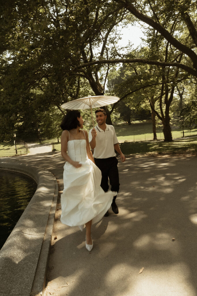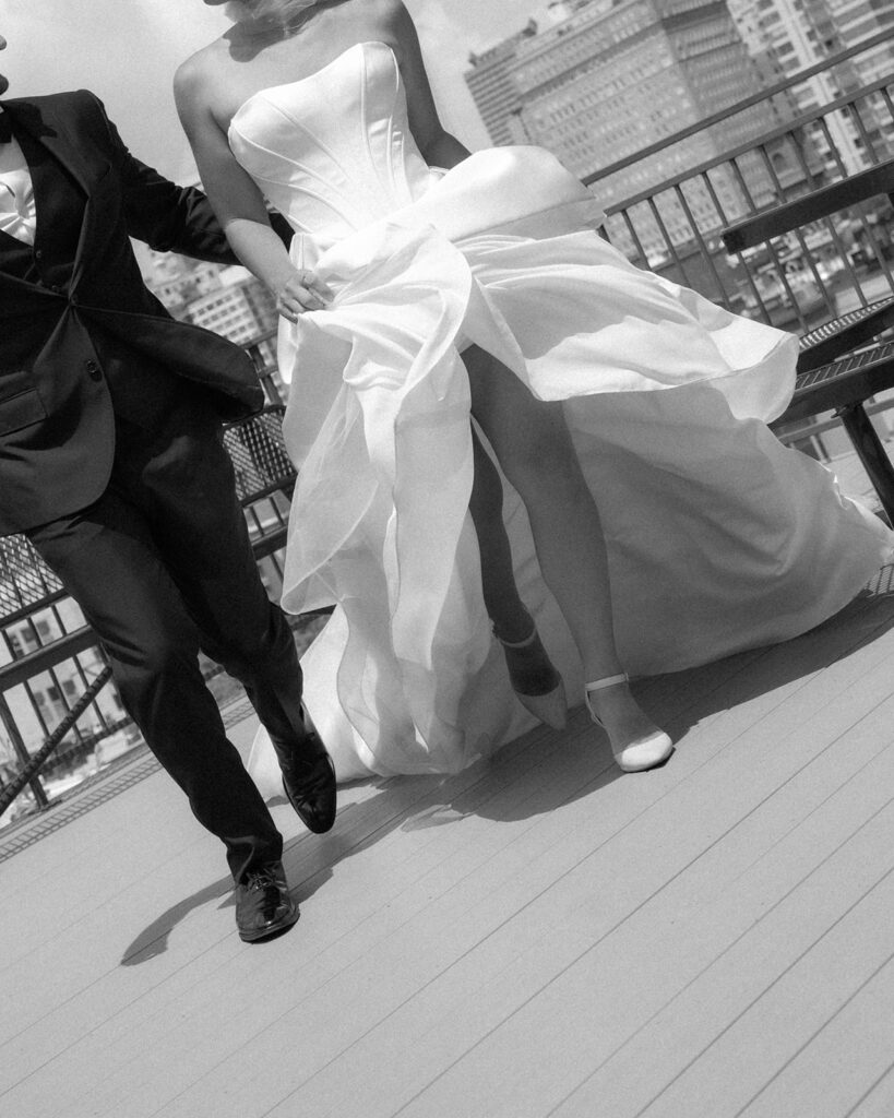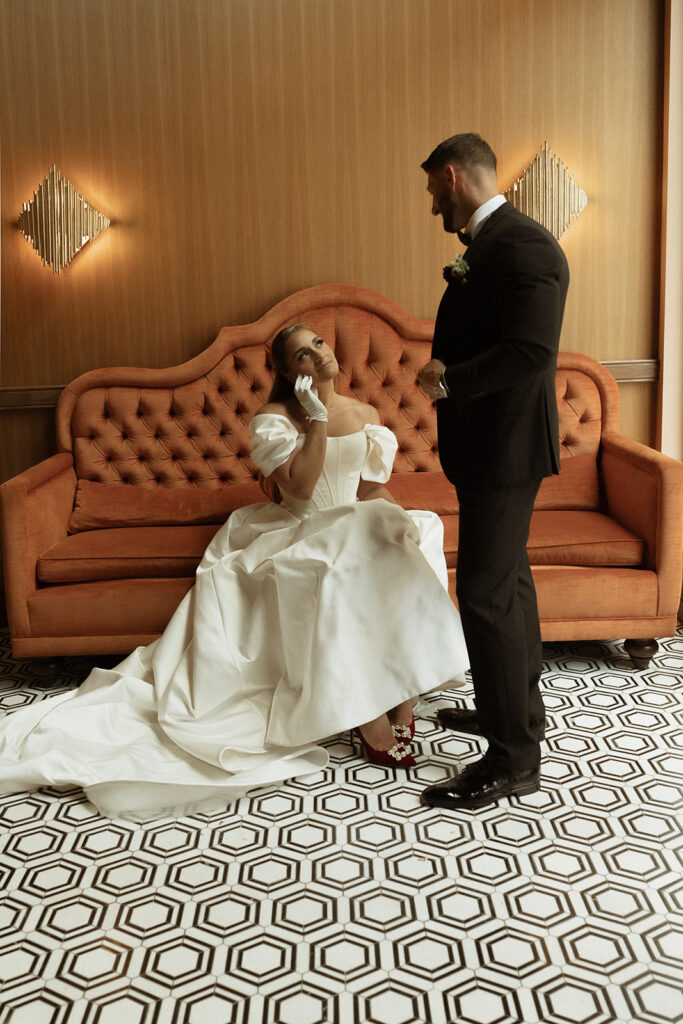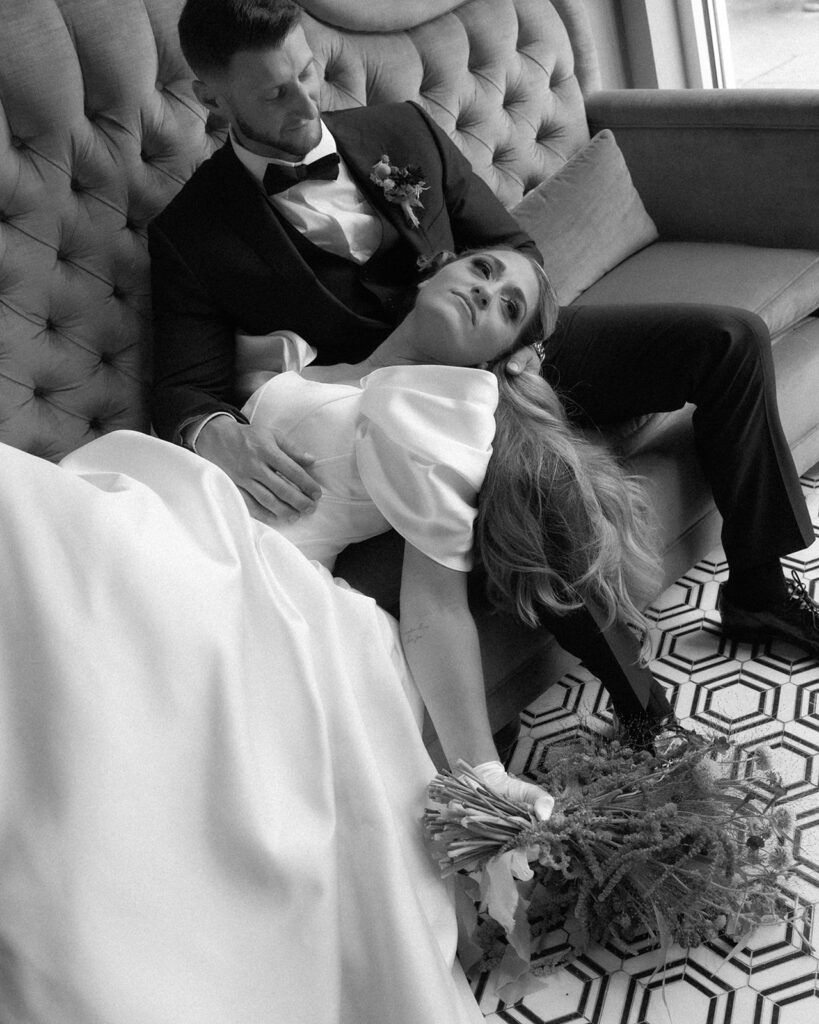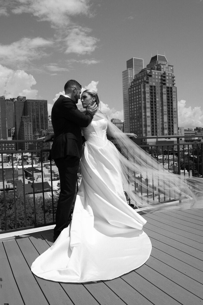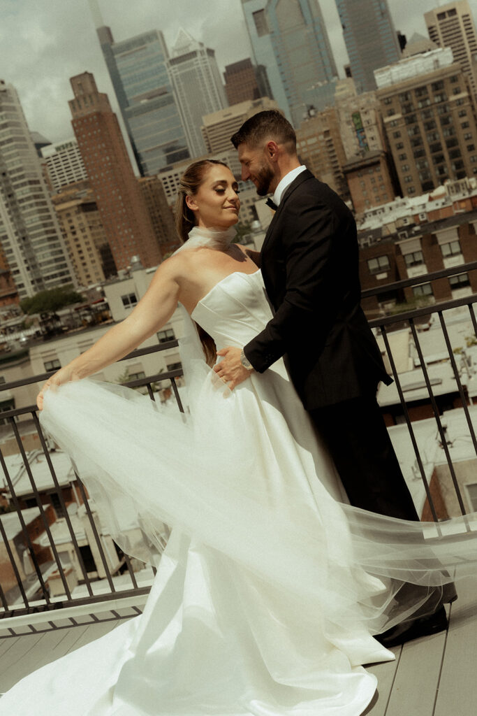 While the lighting was still good, I took the couple out on the rooftop to capture them with the city in the background. I loved the movement shots with her veil blowing—those are always my favorite to capture. I also loved the photos of them posing on the couch, which is really where we started to get into the more editorial posing. We even played around with some props for this as well.
