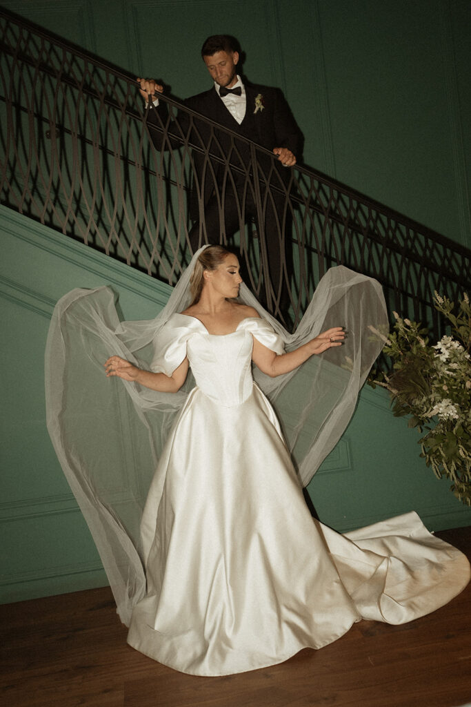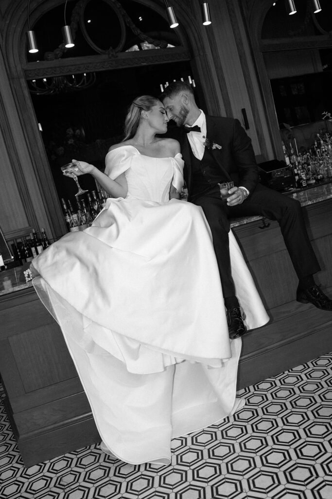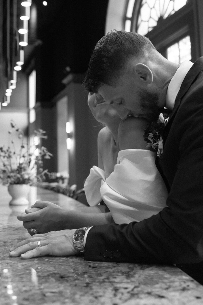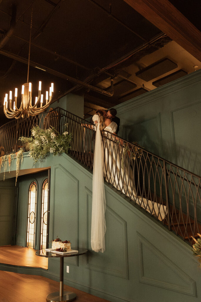 We moved on to the bar where I prompted them to make a drink and share it together. These photos are perfect for couples who maybe want some private photos resembling their cocktail hour at their wedding. Then it was time to move into the main room, where we had the most stunning florals hanging from the balcony and a beautifully decorated table with more florals, candles, fresh fruits, and yummy desserts. I captured so many sweet moments between them—sharing kisses, him kissing her hand, her gorgeous veil draped perfectly on the floor. I really loved incorporating the balcony and the stairs into the photos. We got a lot of editorial moments from that but also documentary style as well, with tons of in-the-moment photos including their cake cutting!