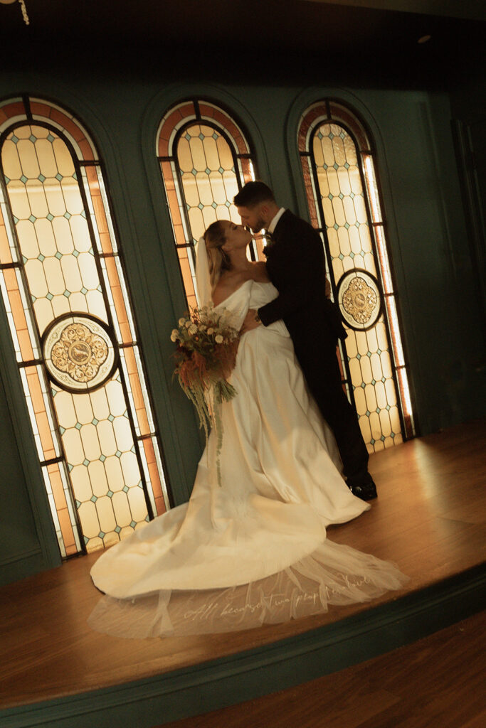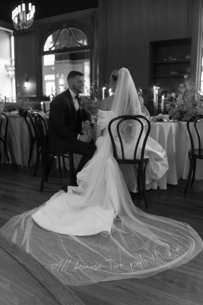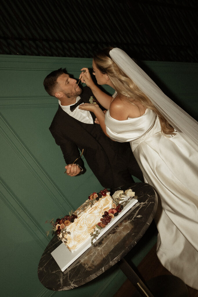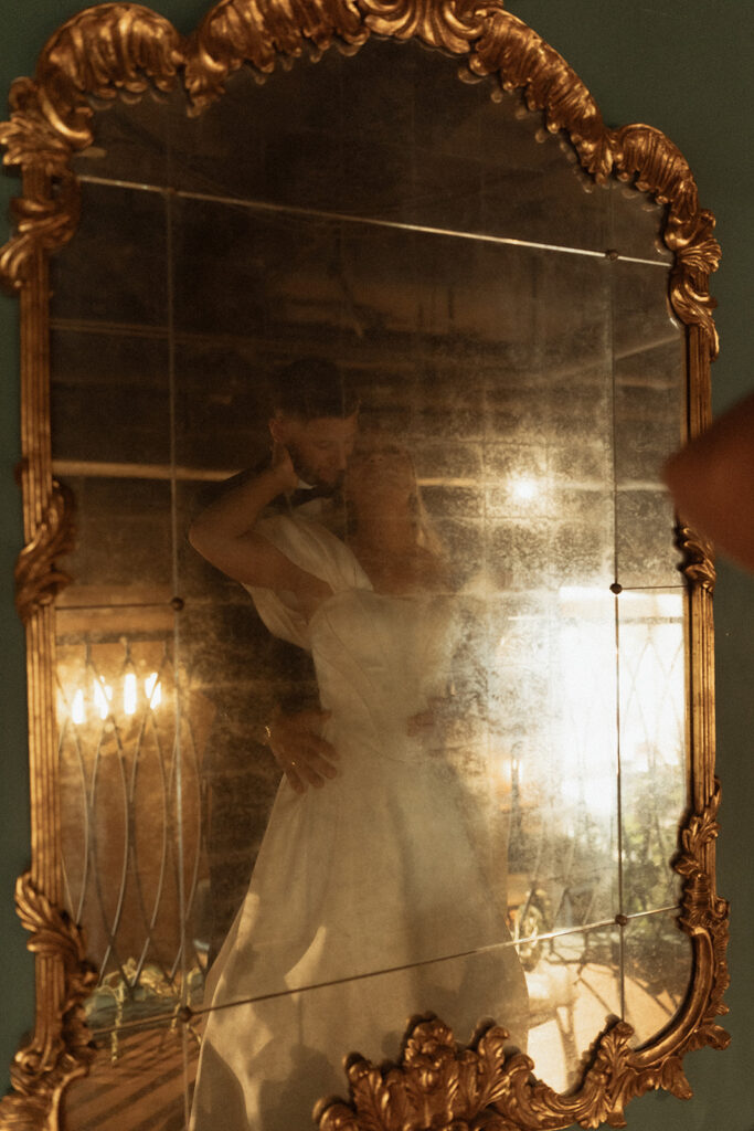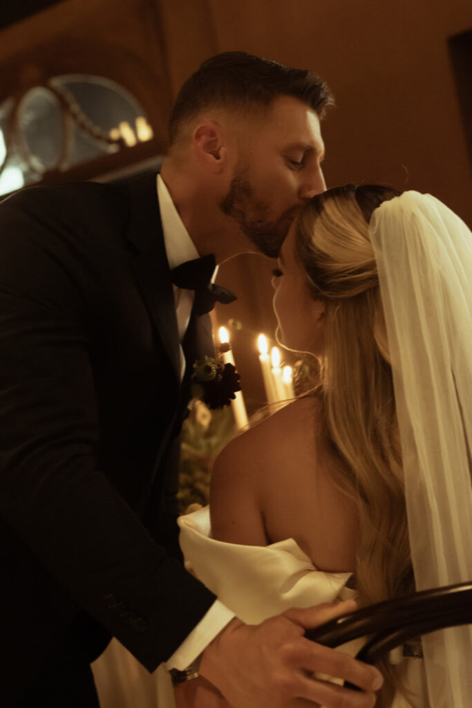 We moved on to the bar where I prompted them to make a drink and share it together. These photos are perfect for couples who maybe want some private photos resembling their cocktail hour at their wedding. Then it was time to move into the main room, where we had the most stunning florals hanging from the balcony and a beautifully decorated table with more florals, candles, fresh fruits, and yummy desserts. I captured so many sweet moments between them—sharing kisses, him kissing her hand, her gorgeous veil draped perfectly on the floor. I really loved incorporating the balcony and the stairs into the photos. We got a lot of editorial moments from that but also documentary style as well, with tons of in-the-moment photos including their cake cutting!